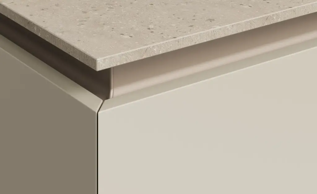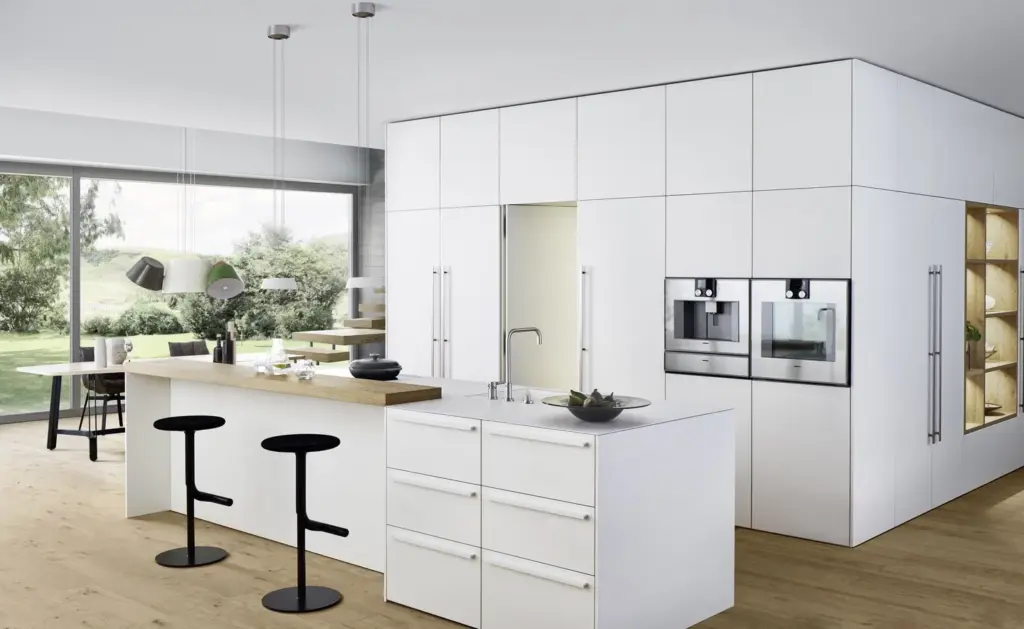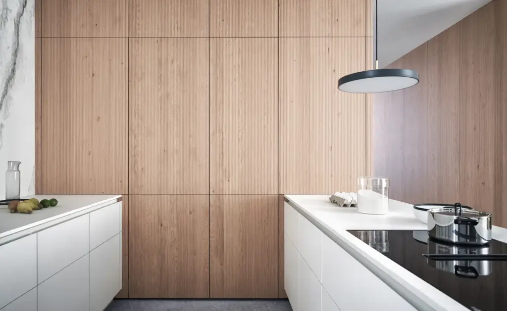 Eine durchgehende Furnieroptik sorgt dafür, dass die Maserung des Holzes oder Dekors über mehrere Schrankfronten hinweg nicht unterbrochen wird, was der Küche eine besonders elegante und hochwertige Anmutung verleiht.