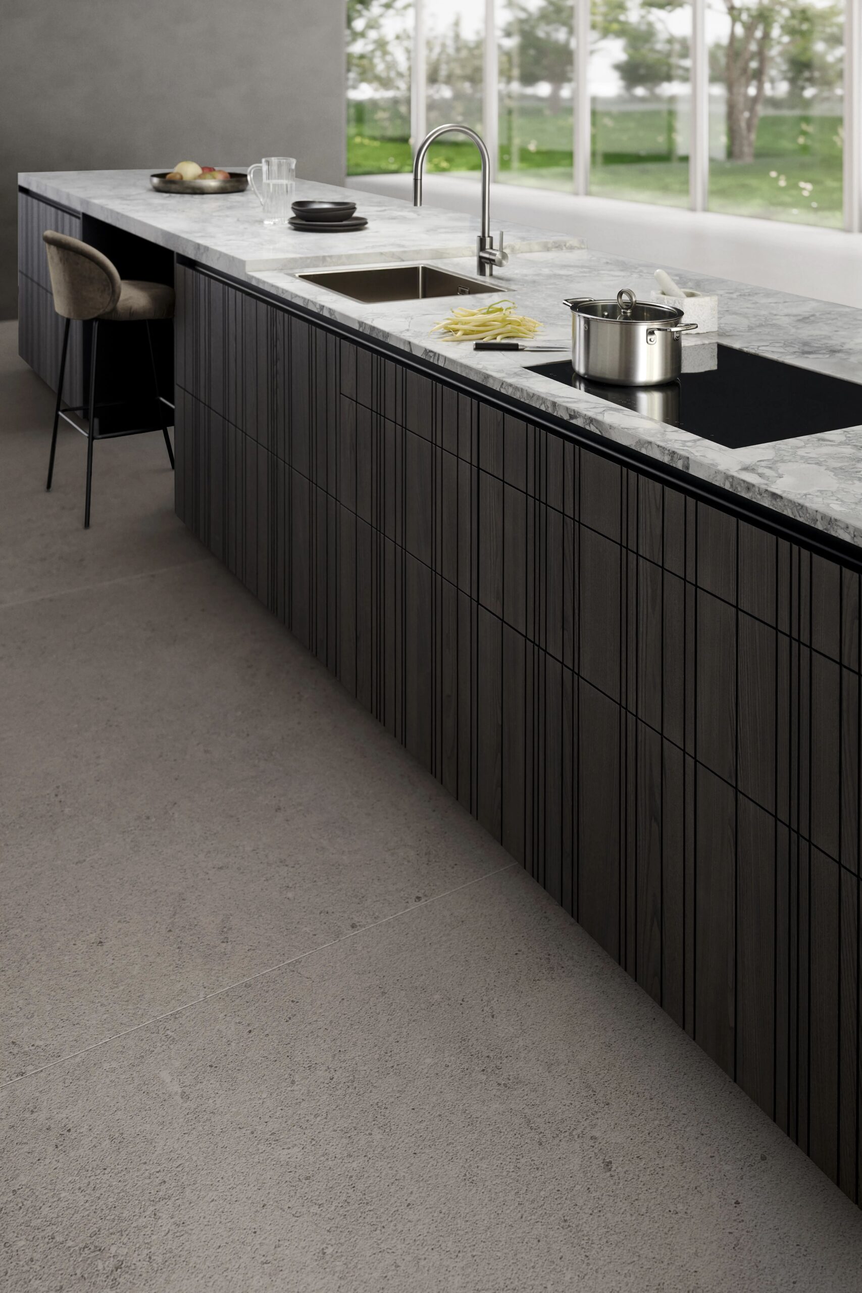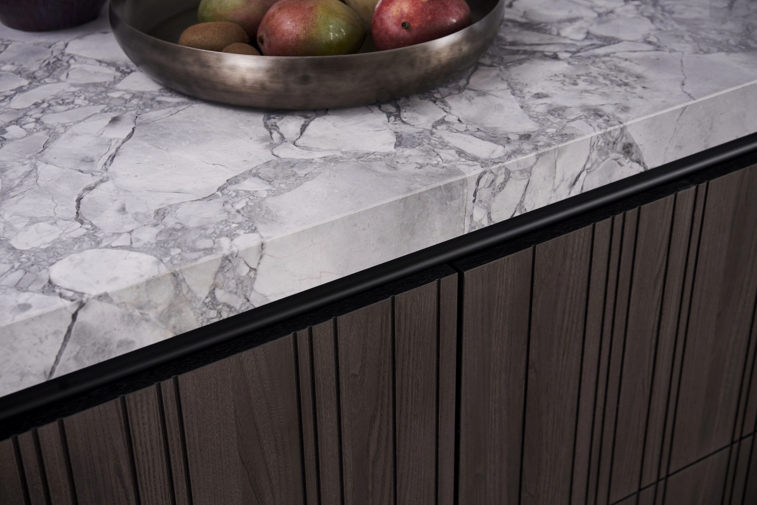 Die einzelnen Schränke verschmelzen optisch zu einem Gesamtmöbel. Diese Besonderheit wird erzeugt, indem die sichtbaren vertikalen Ausfräsungen dunkel gehalten und in der Breite der klassischen vertikalen Fuge ausgeführt sind. Damit wirken die Ausfräsungen optisch wie eine Fuge oder die Fuge wirkt wie eine Ausfräsung – eine perfekte Camouflage.