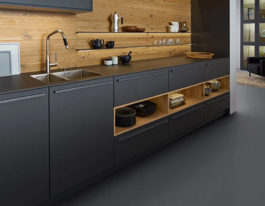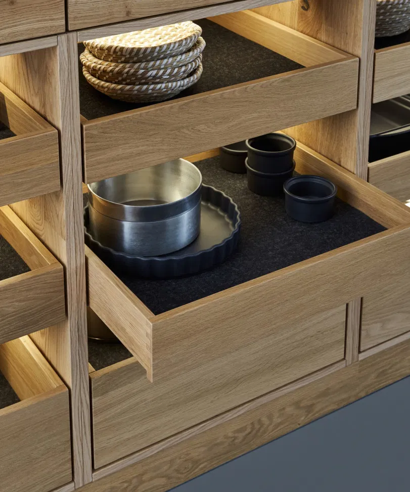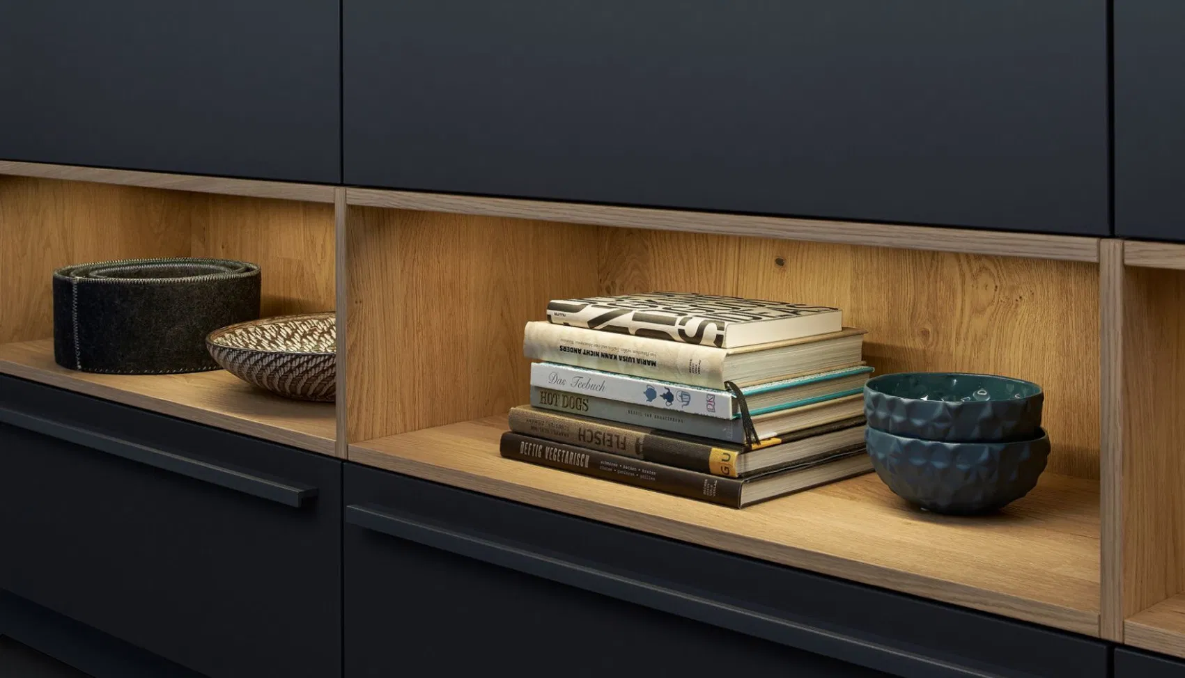 Ruhige, durchgängige Fronten im Wechsel mit dezent beleuchteten Vitrinen und offenen Regalen. Es ist eine reine Freude, das Innenleben zu erkunden: Einsätze und Unterteilungen aus hochwertigem Echtholz erlauben es spielend leicht Ordnung zu halten.
