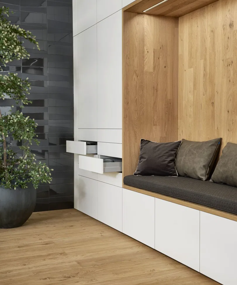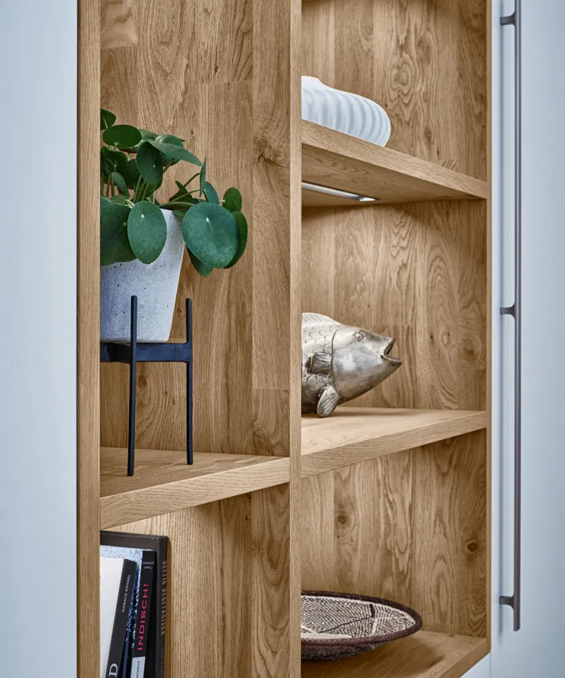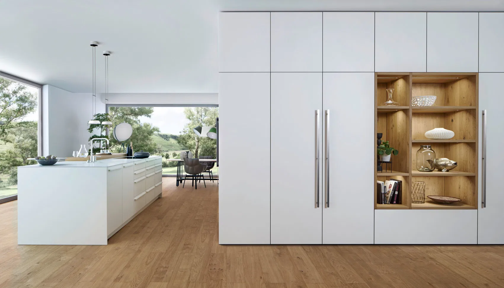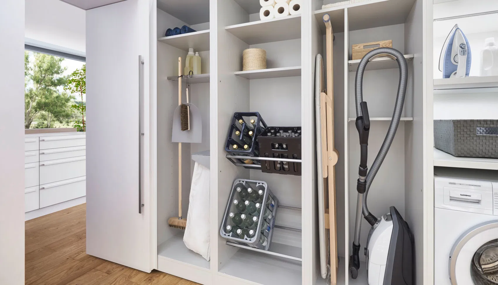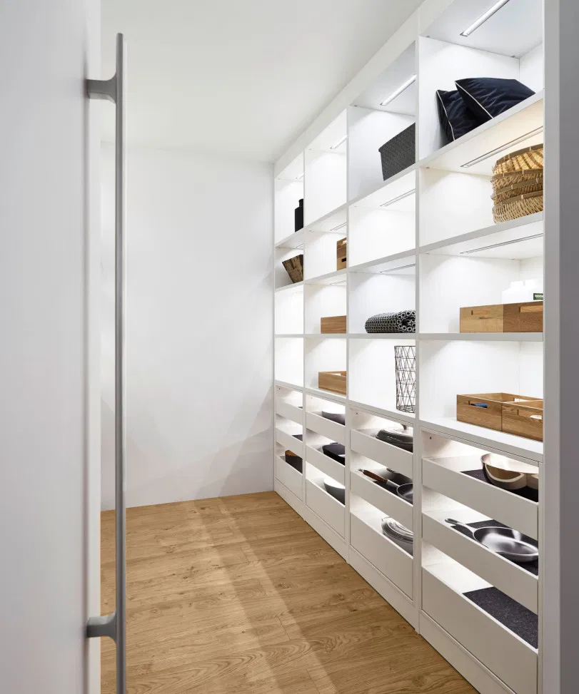 Was sich von außen als großzügige Schrankfront darstellt, ist ein begehbarer Raum: ein kompakter Kubus, der sich durch eine Schwenktür betreten lässt. So ist es nur ein kleiner Schritt von der repräsentativen Küche hinein in den Funktionsraum, der vielfältig nutzbaren Stauraum bietet und sich individuell anpassen lässt.