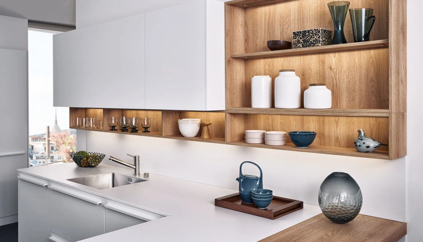 Die Kombination aus lichtem Weiß (mit dezentem Grauanteil) und fein strukturierter Eiche erzeugt ein besonders „luftiges und warmes“ Ambiente. Offene Regale und Fächer unterstützen diese wohnliche Atmosphäre und machen die Küche zum integrierten Teil des Wohnraums.