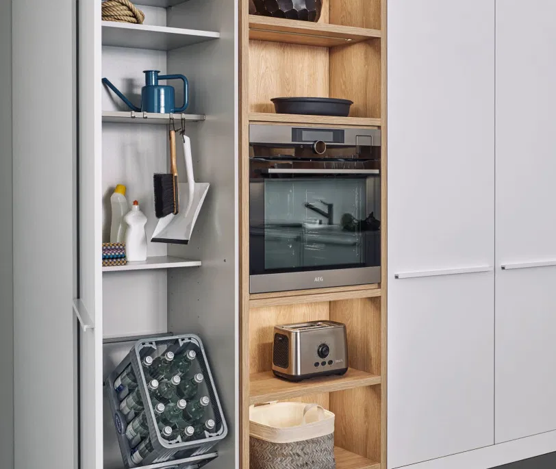 Durch die harmonische Verbindung von hellen Fronten und warmen Holzelementen wirkt die Küche wie ein Möbelstück. Die „Easy to Handle“-Philosophie sorgt zudem dafür, dass trotz der wohnlichen Optik alle funktionalen Stauraum-Bedürfnisse perfekt abgedeckt sind.