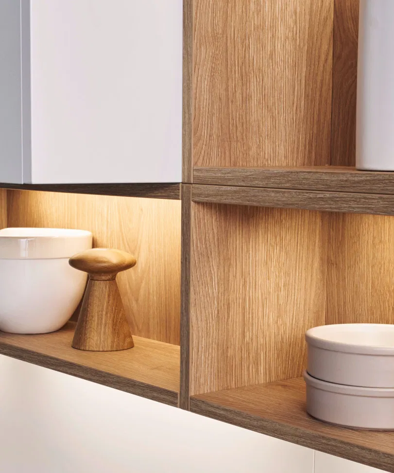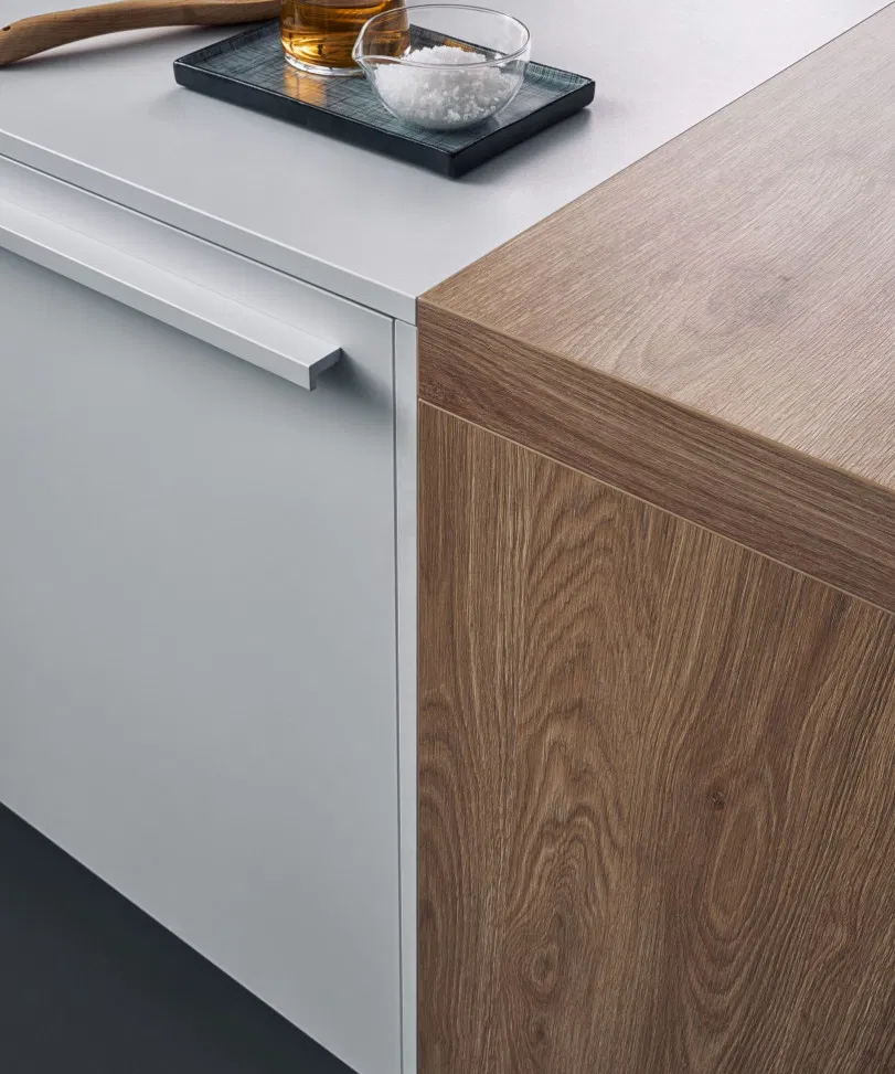 Das Zusammenspiel von BONDI und SYNTHIA verkörpert modernes Wohndesign in seiner harmonischsten Form. Während die Kollektion BONDI mit ihrer samtmatten Anti-Fingerprint-Oberfläche für eine ruhige, puristische Basis sorgt, setzt die SYNTHIA mit ihren authentischen Holzdekoren warme, wohnliche Akzente. Diese Kombination ist ideal für offene Wohnküchen: Die matten Fronten wirken architektonisch klar, während die Holzstruktur der SYNTHIA-Elemente – ob als Inselelement oder Regal – eine einladende Atmosphäre schafft
