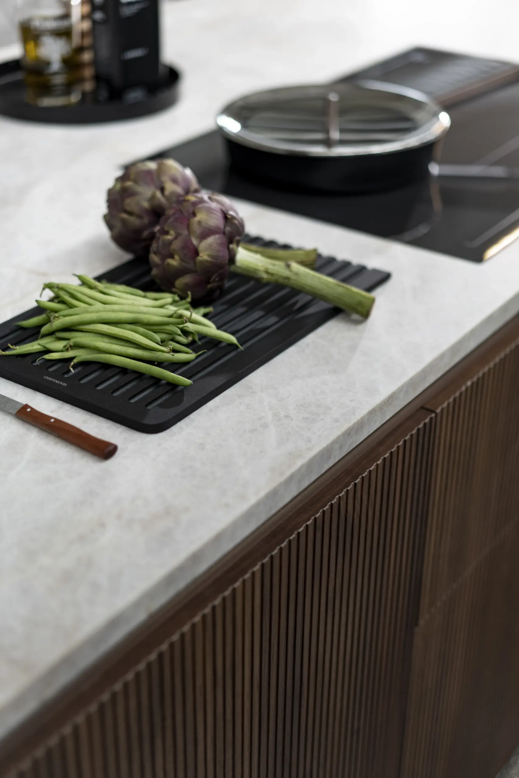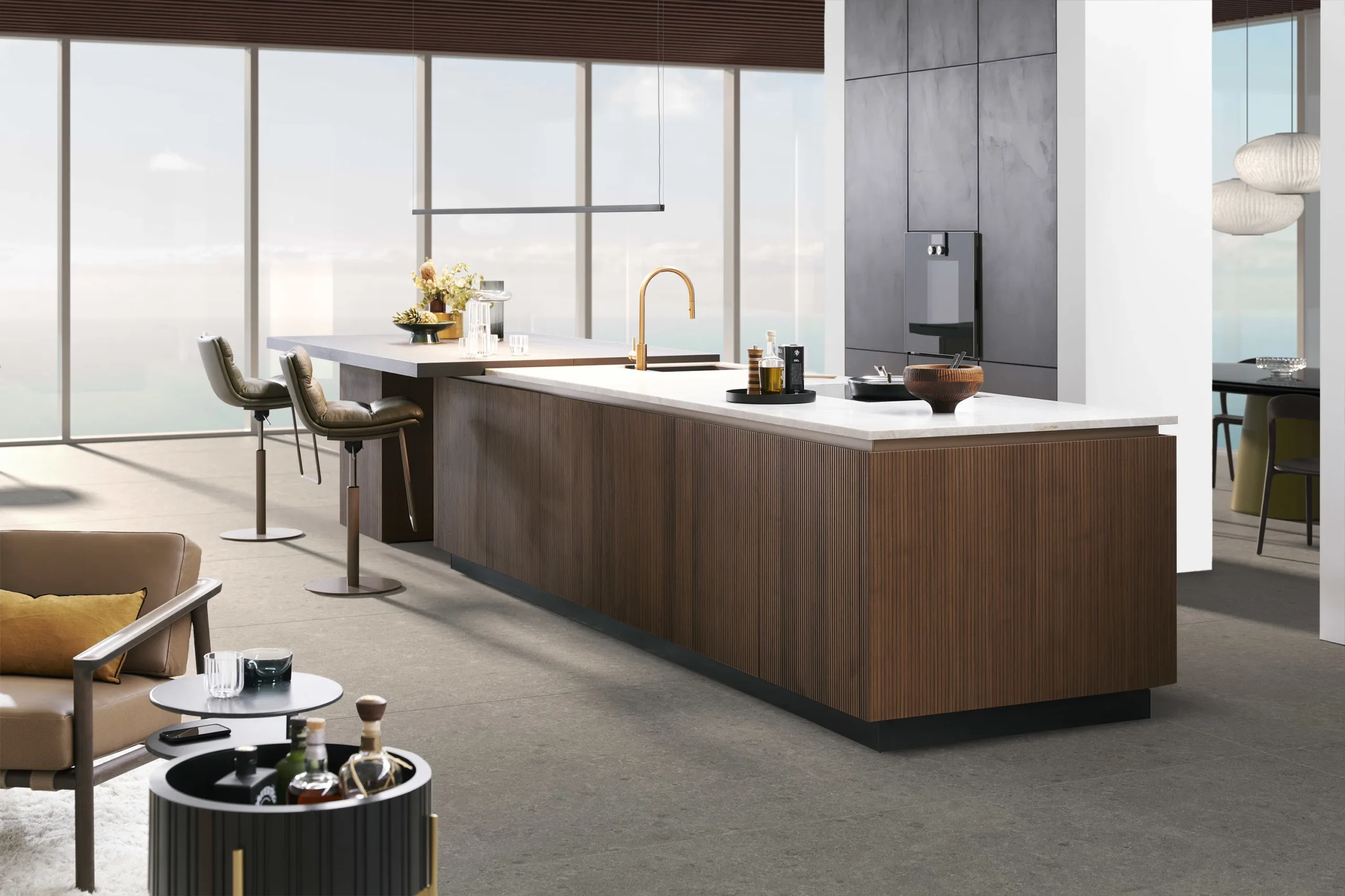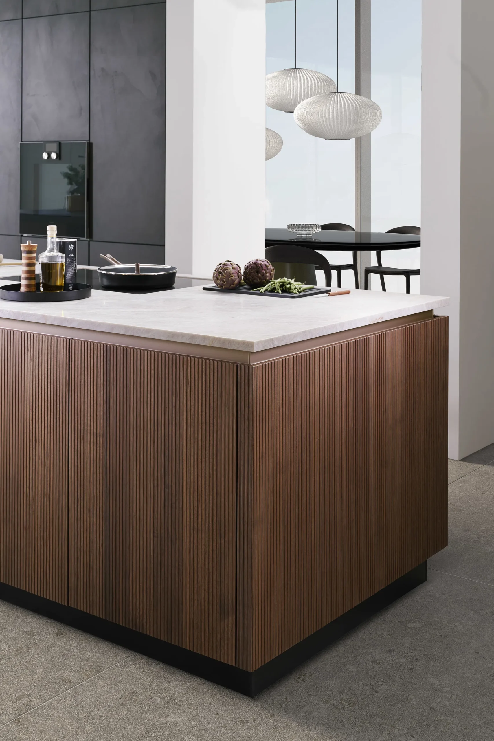 Die mehrfach prämierte BOSSA-Front (hier in Walnuss) besteht aus vorstehenden, linearen Stäbchen. Diese kreieren ein besonders lebendiges und warmes Gesamtbild, das der Küche eine haptische Tiefe und eine architektonische Struktur verleiht.