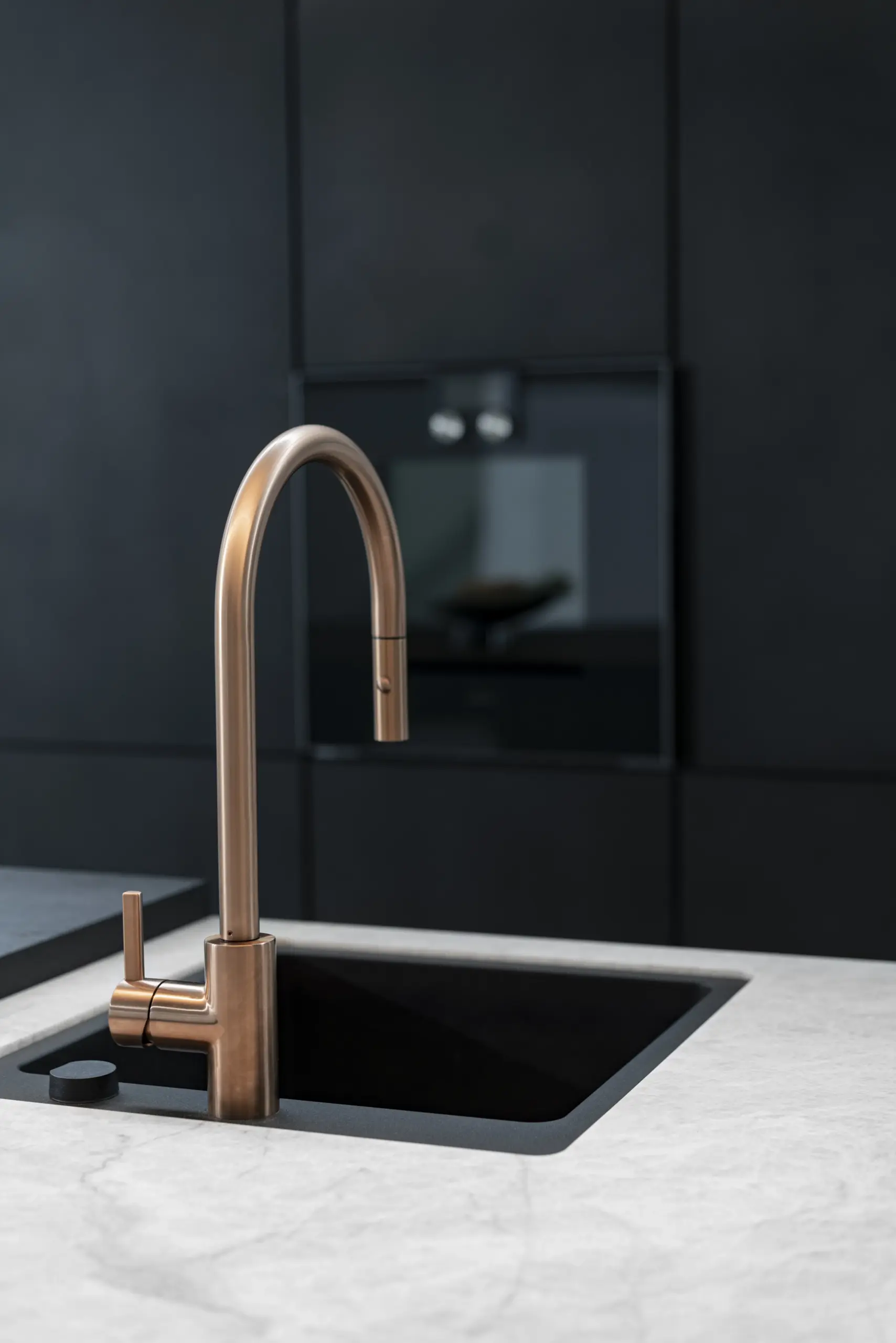 Das Sideboard in Carbongrau verbindet urbane Eleganz mit funktionaler Vielseitigkeit. Es bietet Platz für Kaffeemaschinen und essentielle Küchenutensilien, während eine durchgehende Naturstein-Leiste in ROCCA die Materialität des Inselblocks aufgreift. Dieses Zusammenspiel aus Material und Form schafft ein stimmiges Raumkonzept, das sich nahtlos durch den gesamten Raum zieht.