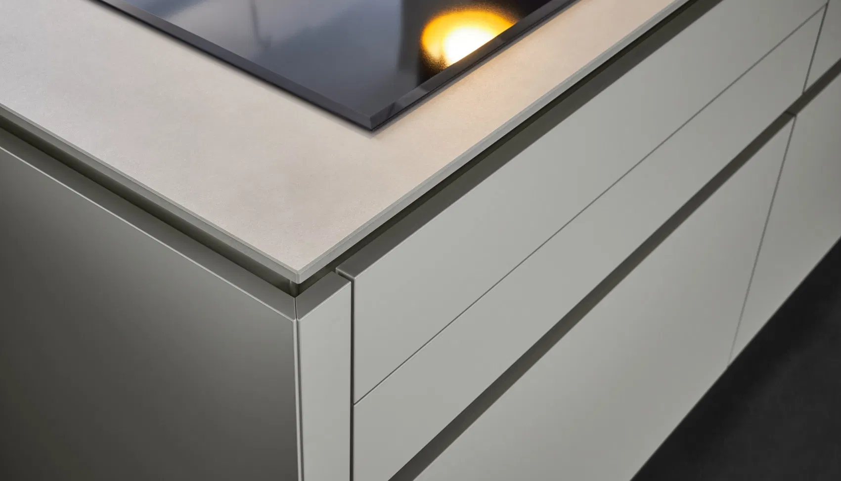Grifflose Fronten runden dieses klare und ruhige Küchenarrangement ab. Beim Öffnen der elegant verarbeiteten Auszüge zeigt sich das ganze Spektrum von Form, Funktionalität und praktikablem Stauraum.