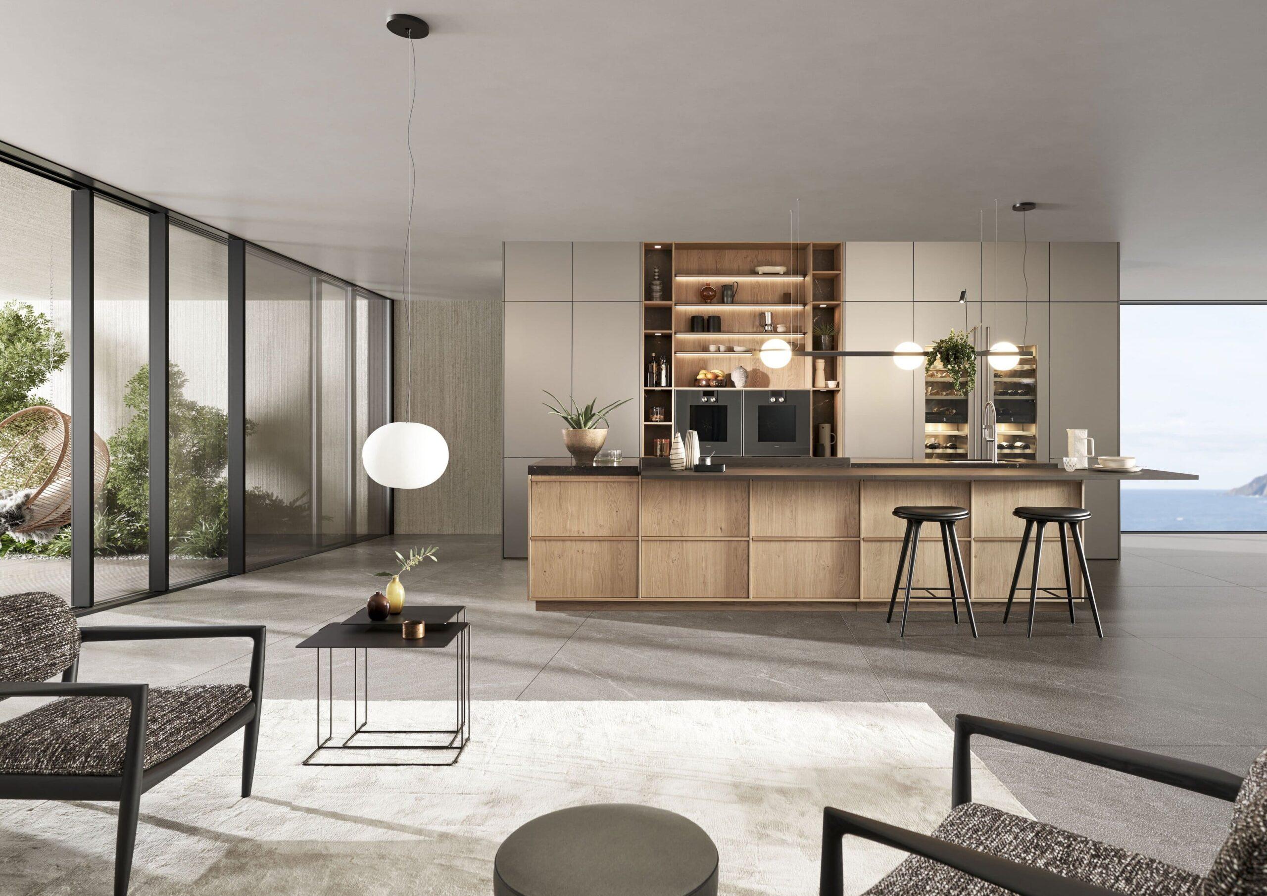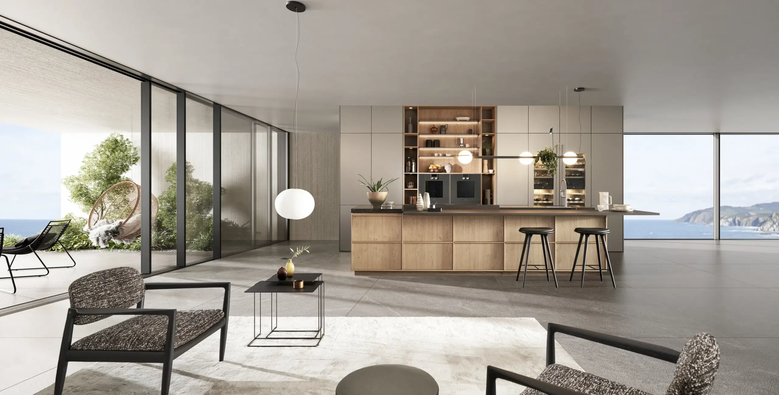Durch eine offene Wohnraumplanung mit fließenden Übergängen schafft die KYOTO eine harmonische Verbindung zwischen Küche, Wohnzimmer und Außenbereichen wie dem Wintergarten. Das Konzept setzt auf Helligkeit und Transparenz, um ein sinnliches und beruhigendes Szenario zu kreieren.