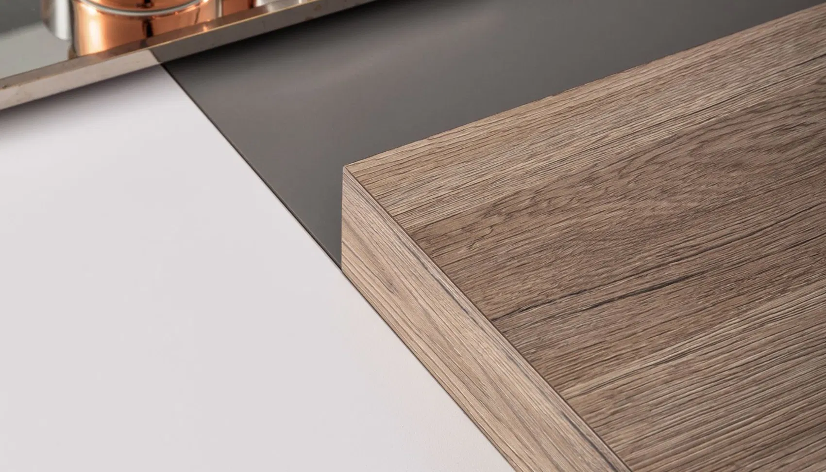 Materialien und Farben akzentuieren die Raumarchitektur. Das Besonders natürlich wirkende antikeiche-dekor mit sichtbaren Ästen, Rissen und fühlbarer Maserung belebt die grifflose Hochschrankwand. Der 6 cm starke Thekenaufsatz in antikeiche stellt eine optische Verbindung zwischen Hochschränken und Insel her.