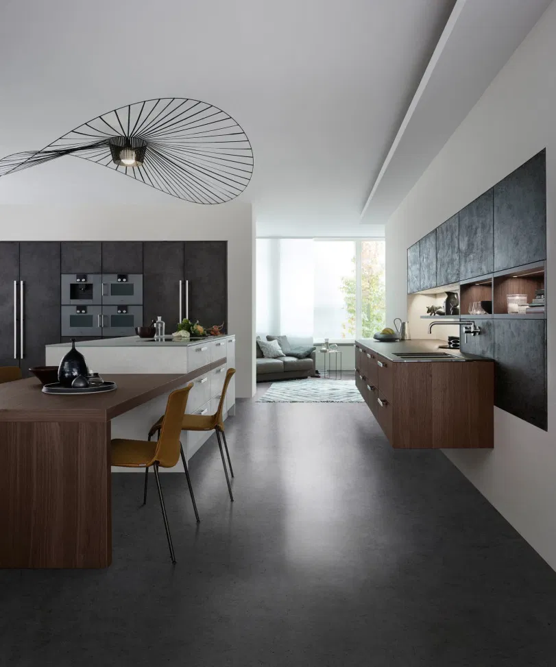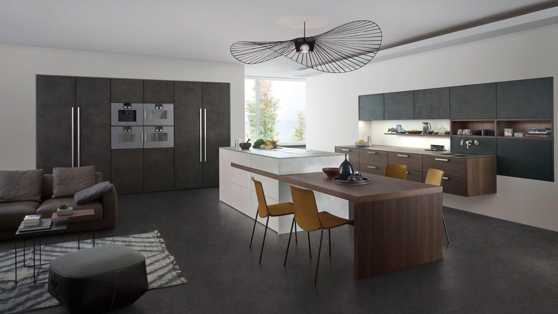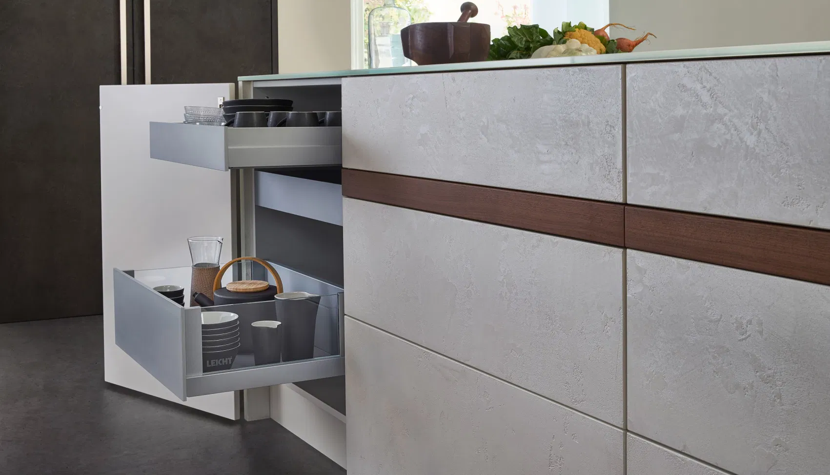 Insel und Sideboard bringen Leichtigkeit in die Küchenarchitektur – und wirken auch bei geöffneten Auszügen ästhetisch und aufgeräumt. Im Zentrum der CONCRETE steht die Insel in reizvollem Farbkontrast in gebrochenen Weiß. In der offenen Küche übernimmt sie sehr elegant gleich mehrere Funktionen.