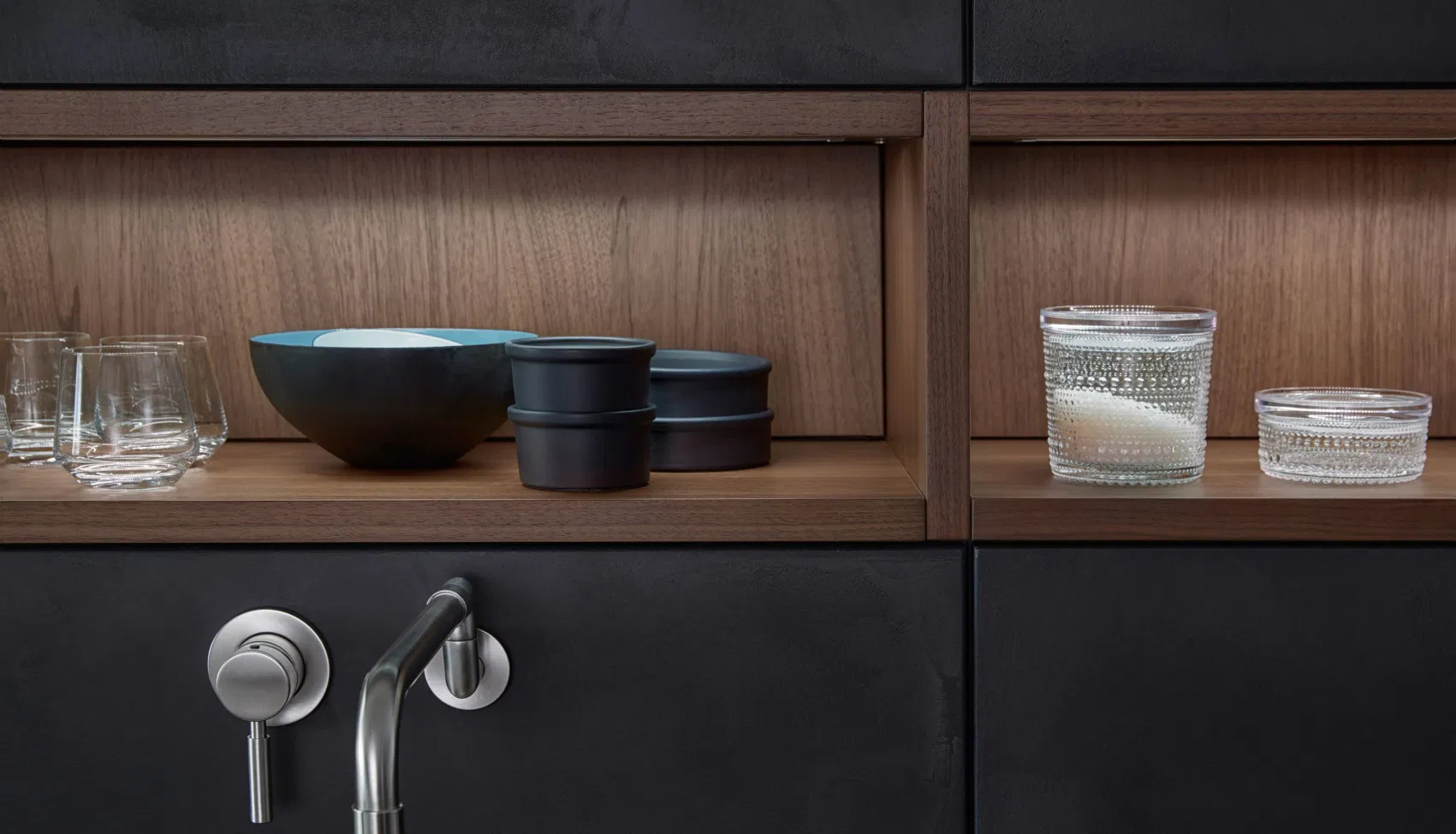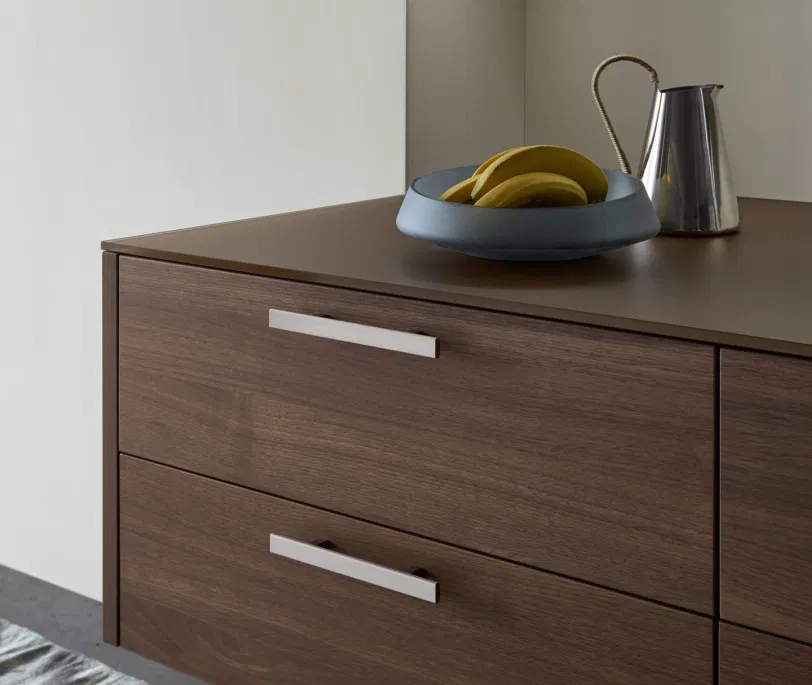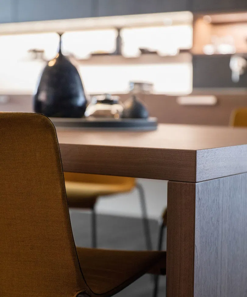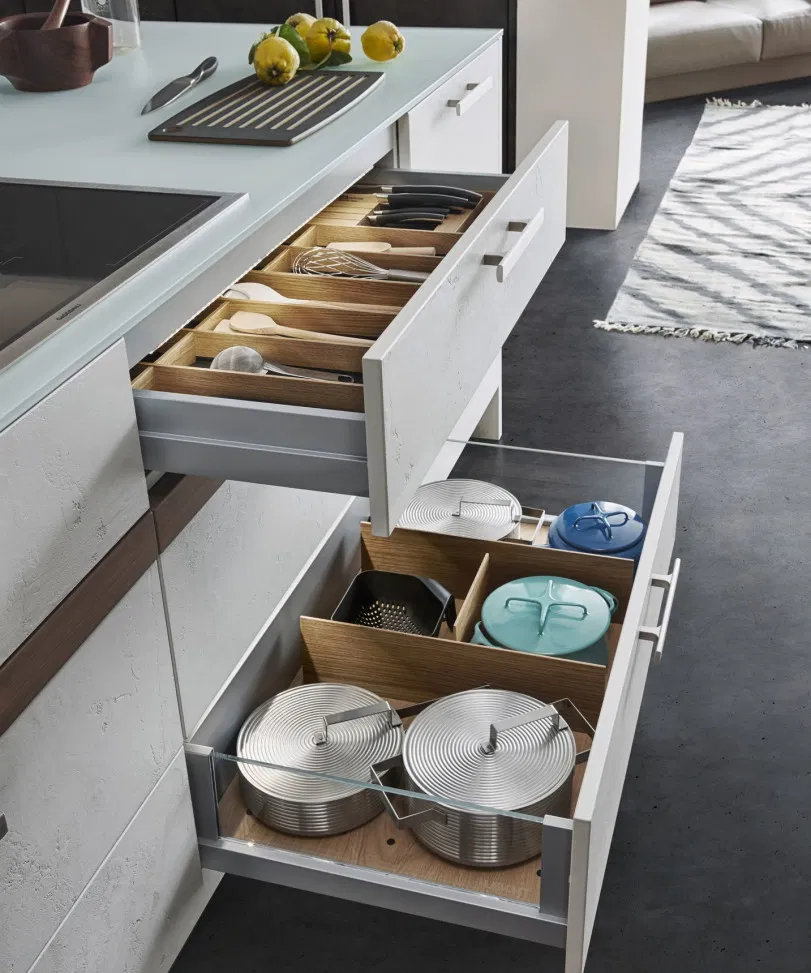 Insel und Sideboard bringen Leichtigkeit in die Küchenarchitektur – und wirken auch bei geöffneten Auszügen ästhetisch und aufgeräumt. Im Zentrum der CONCRETE steht die Insel in reizvollem Farbkontrast in gebrochenen Weiß. In der offenen Küche übernimmt sie sehr elegant gleich mehrere Funktionen.