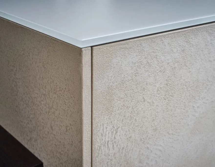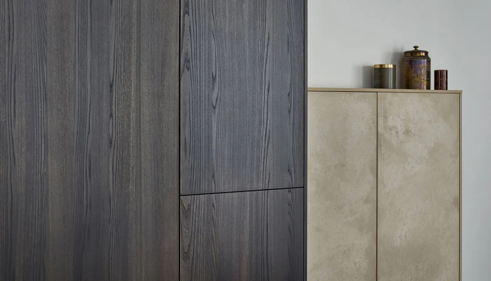 Das Design besticht durch eine einzigartige, warme und wertige Ausstrahlung. Diese wird durch die Kombination einer handwerklich ausgeführten Oberfläche in Sandsteinoptik mit eleganten, dunklen Echtholzfronten erzielt, was der Küche eine feine, leicht „rauchige“ Note verleiht.