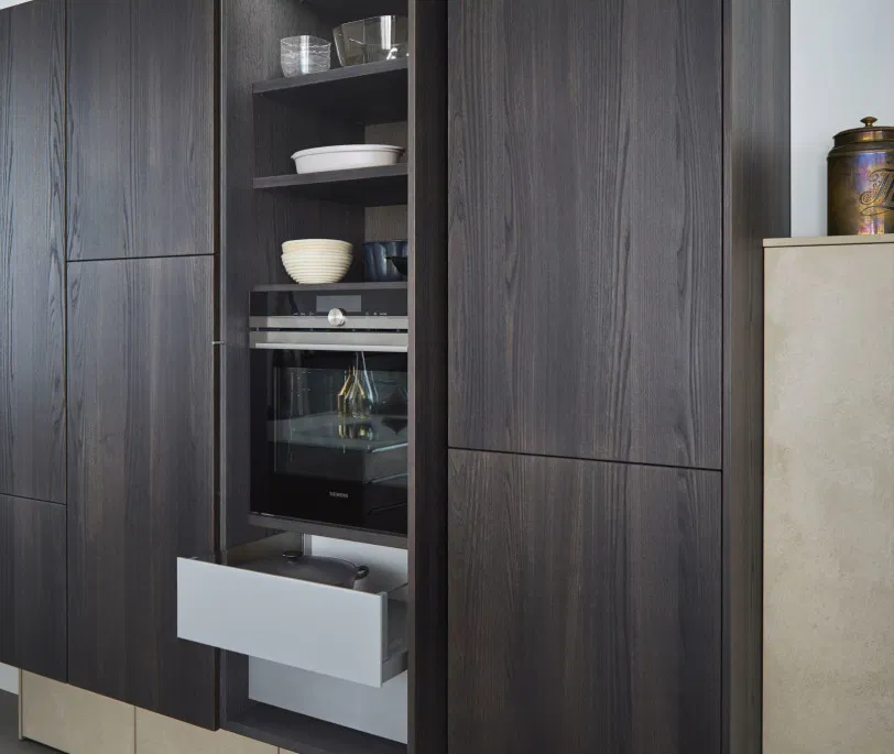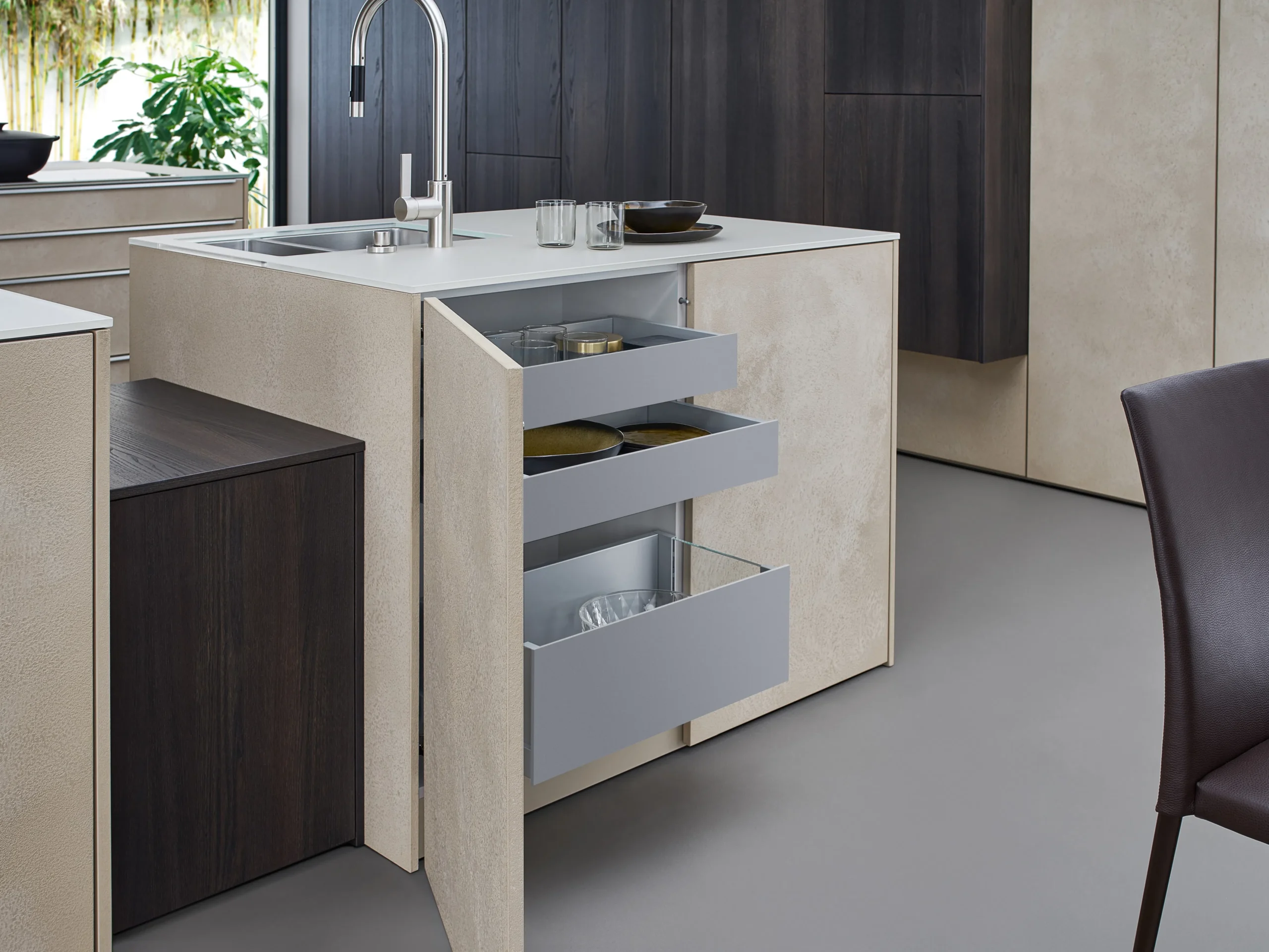 Raumgreifend, wertig und neu komponiert. In der Kombination aus einer handwerklich ausgeführten Oberfläche in Sandsteinoptik sowie eleganten, dunklen Echtholzfronten hat die Küche eine einzigartige warme und wertige Ausstrahlung – mit einer sehr feinen, leicht „rauchigen“ Note. Die gleiche Wertigkeit prägt auch das Innenleben.