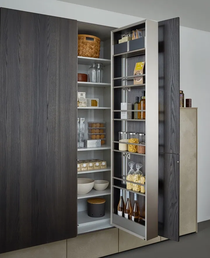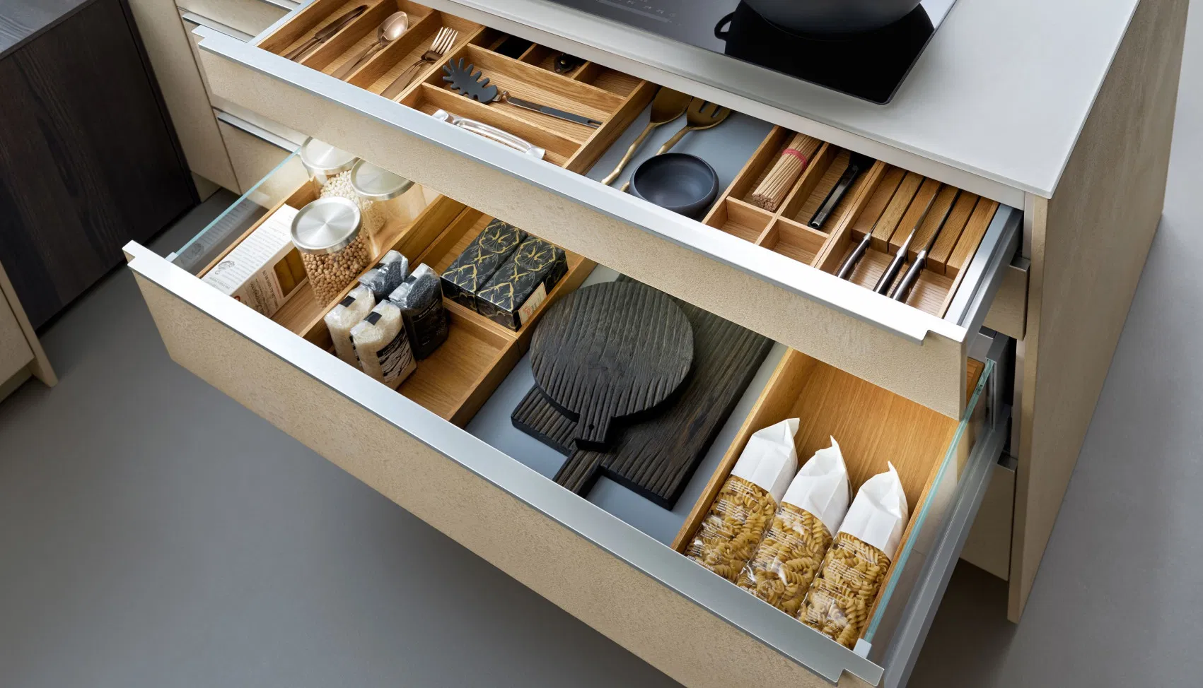 Ja, die hohe Material- und Verarbeitungsqualität der Fronten setzt sich konsequent im Innenleben fort. Die Wertigkeit der äußeren Komposition aus Sandsteinoptik und Echtholz prägt gleichermaßen die inneren Ausstattungsdetails der Schränke.