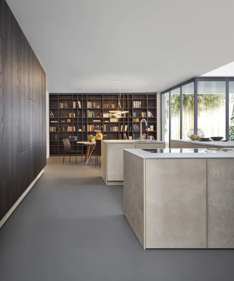 Bei TOPOS | STONE wird die Küche als Teil des gesamten Raumes begriffen. Das Planungskonzept umfasst nicht nur die Küchenelemente selbst, sondern erstreckt sich auf den hochwertigen Innenausbau bis hin zu maßgefertigten Regalsystemen, sodass Kochen und Wohnen nahtlos verschmelzen.